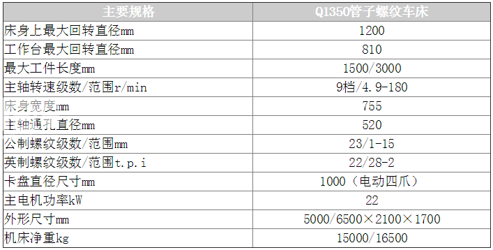 Q1350型管子螺紋車床是專為大口徑管件進(jìn)行車削加工而設(shè)計(jì)的臥式車床,在具備普通車床的全部功能的同時(shí),專業(yè)用于大口徑管件及棒件的加工,廣泛應(yīng)用于機(jī)械制造、石油、化工、煤炭、地質(zhì)勘探、城市給排水等行業(yè)的機(jī)械加工作業(yè);車床主軸通孔大、主軸箱前后均有卡盤、并配備有錐度杠,主軸通孔直徑520mm,可用于加工直徑范圍330mm-510mm的各種內(nèi)外螺紋,包括公制、英制、錐度螺紋等,同時(shí)可對軸類、盤類零件進(jìn)行外圓、內(nèi)孔和端面的加工。