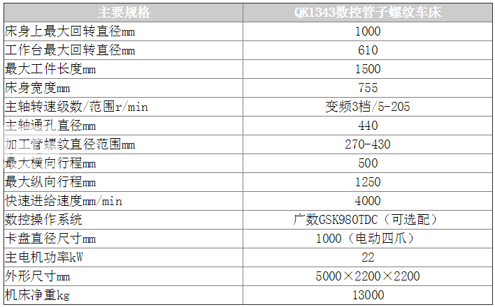 QK1343型數(shù)控管螺紋車床是針對石油、化工、冶金行業(yè)輸油管、鉆桿、套管的螺紋加工要求專業(yè)化設計制造。機床采用雙卡盤夾緊方式,數(shù)控系統(tǒng)自動控制,可******加工各種內(nèi)、外螺紋,并具有普通數(shù)控車床的功能