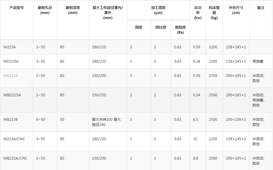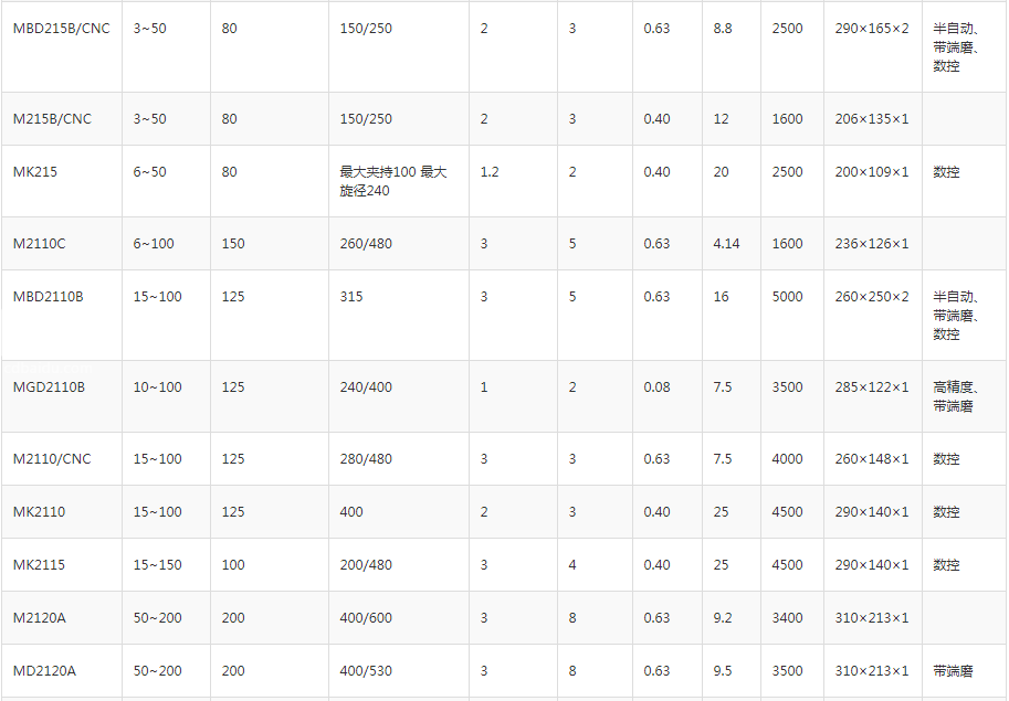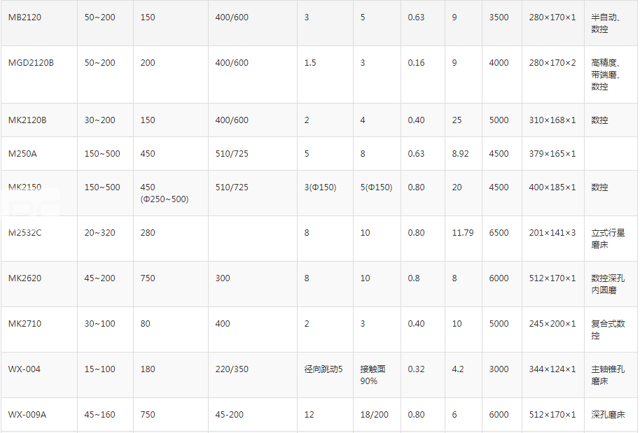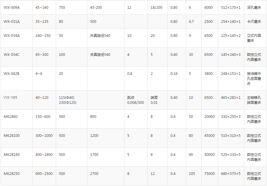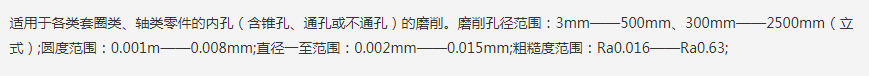 內(nèi)圓磨床:適用于各類套圈類、軸類零件的內(nèi)孔(含錐孔、通孔或不通孔)的磨削。磨削孔徑范圍:3mm——500mm、300mm——2500mm(立式);圓度范圍:0.001m——0.008mm;直徑一至范圍:0.002mm——0.015mm;粗糙度范圍:Ra0.016——Ra0.63;