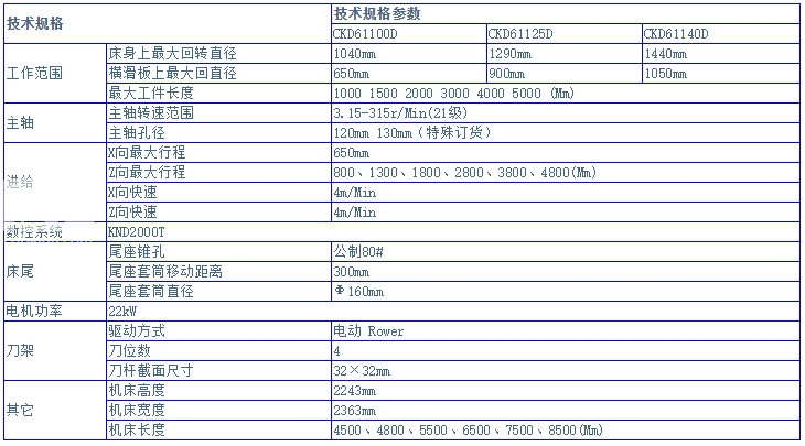 CKD611XXD系列型數(shù)控車床是本廠自行研制開發(fā)的數(shù)控車床,為大規(guī)格數(shù)控車床產(chǎn)品中的精品。高效率、高穩(wěn)定性、高精度、高通用性、高剛性等一系列機床優(yōu)良品質(zhì)均體現(xiàn)在CKD611XXD系列數(shù)控機床的設(shè)計和制造中。床身采用平-V導(dǎo)軌,經(jīng)過中頻淬火和精密磨削,剛性高,可承受重載精密切削。機床配置KND2000T控制系統(tǒng)和伺服進給電機,功能完善,性能可靠。選用國內(nèi)******滾珠絲杠,精度好,效率高。
